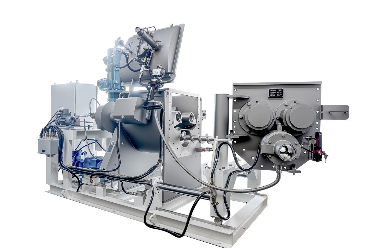 During the mixing cycle, the screw moves the material within the reach of the mixing arms, ensuring that all ingredients are thoroughly mixed while also speeding up the mixing process. During unloading, the direction of the screw rotation is reversed and the mixed material is extruded through the appropriate die holes on the side of the machine. The extruder screw has its own, separate drive, so that the blades and the screw work independently.